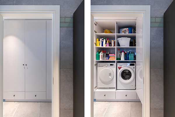 הצד השני משרת את חדר השינה ומשמש כארון כביסה עם מכונות מוגבהות שחוסכות את הצורך להתכופף, בצד ארון נעליים גדול.
