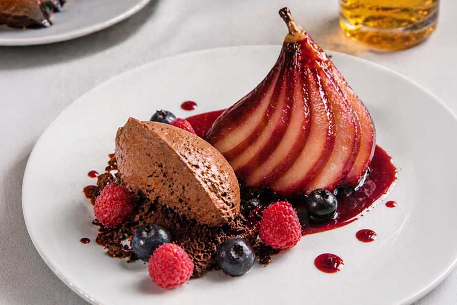 שמים בצלחת שני חצאי אגס ולצידם כף מוס שוקולד מריר זולגים מעל מעט רוטב יין.