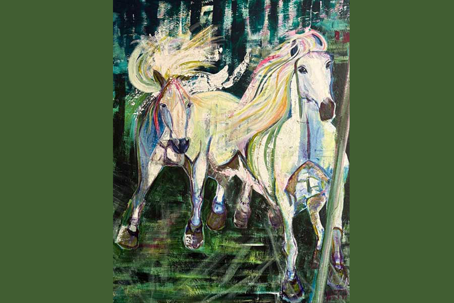 יפה דגן – תציג ציורי אקריליק על בד, העוסקים בדימויים מגוונים: צורות מופשטות, דמויות אנושיות, צמחים ובעלי חיים שבמרכזם מופיע הסוס – חיה אצילית , סוערת וחופשית, שהאמנות המערבית ראתה בה מאז ומעולם סמל של עוצמה של מסע פנימי. ציורים אחרים שיוצגו מתארים ציפורים כמו : תוכים צבעוניים, עיט במעופו. הציורים גדולי מימד ועוצמתיים, בקווים חופשיים ובצבעוניות עזה ואקספרסיבית. החיות אינן רק אובייקטים חזותיים אלא מטאפורות לכוח, תשוקה וחופש המהדהדים רגשות אנושיים עמוקים. הצופה מוזמן להיכנס אל תוך מרחב שבו צבע תנועה ודימוי מתלכדים לחוויה טוטלית רבת רבדים.
